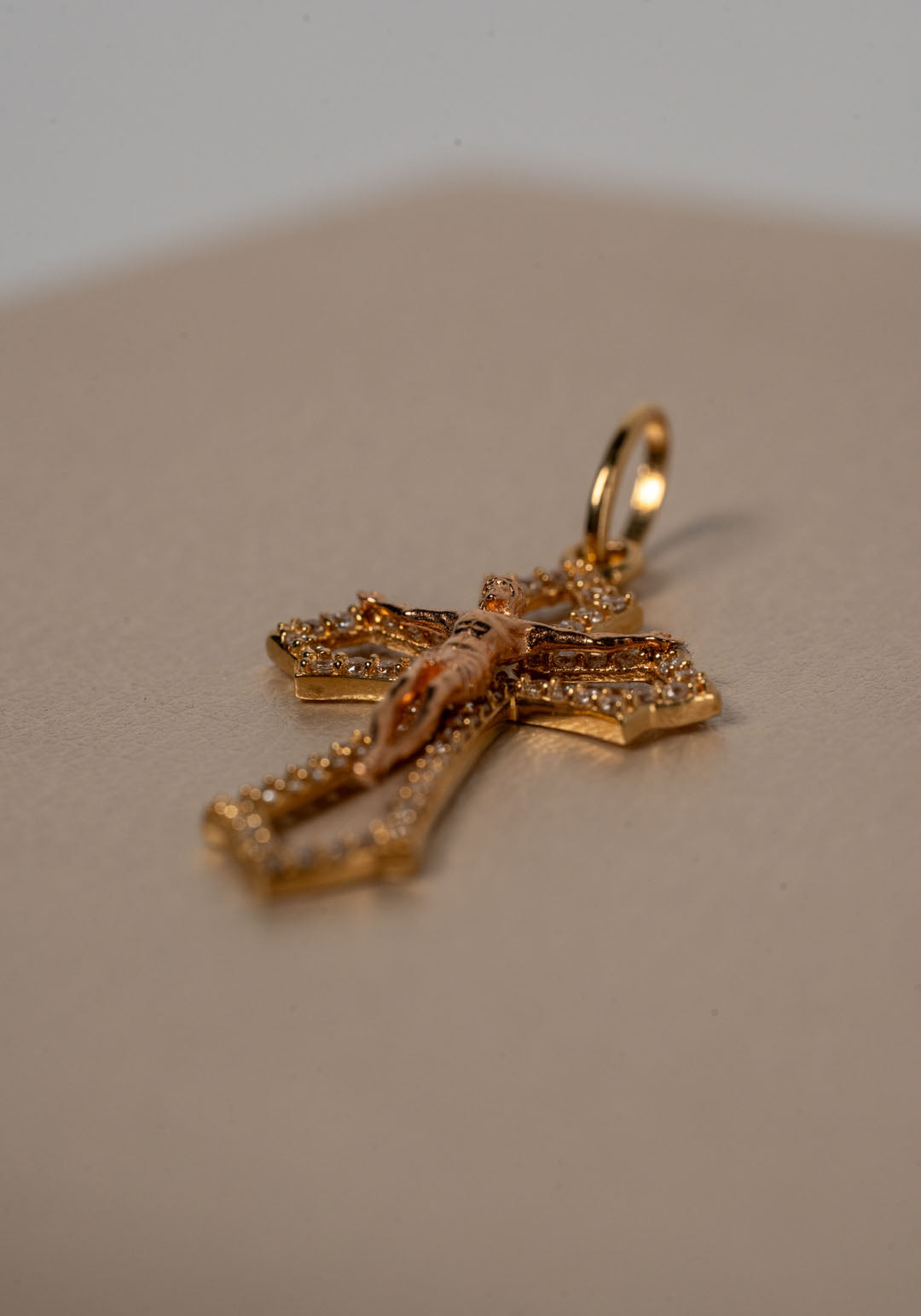 Crucifijo en oro amarillo de 18k, realzado con circones blancos que aportan un brillo sutil y refinado.